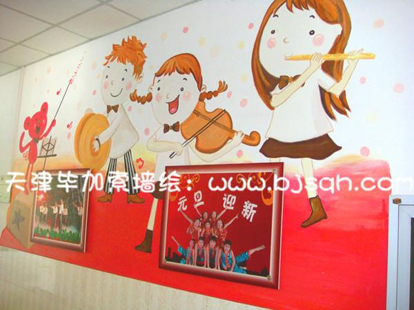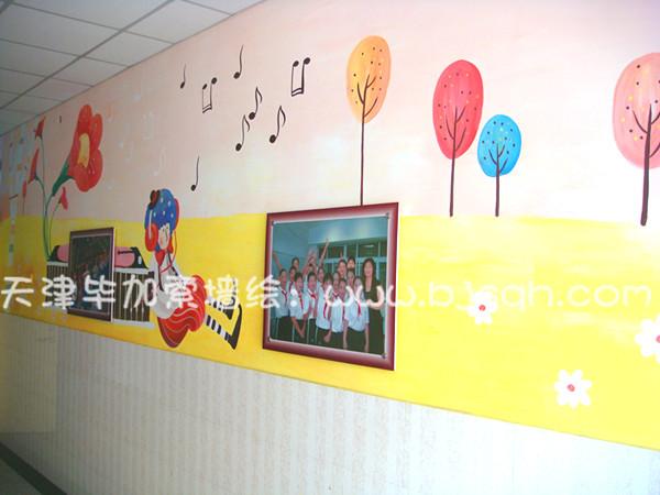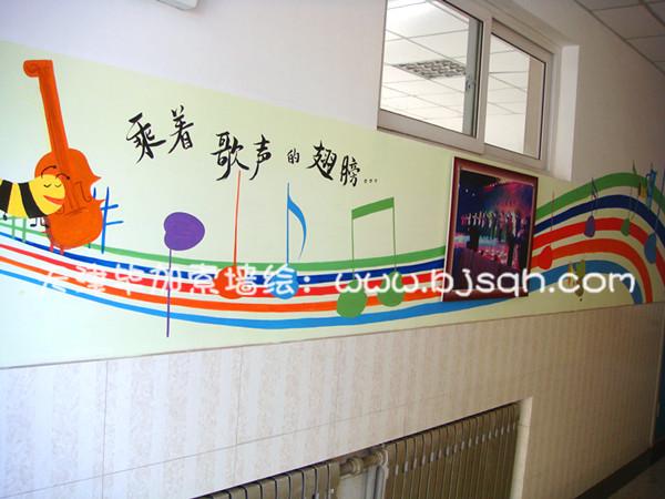 一層左邊主要是音樂(lè)教室,所以彩繪處處體現(xiàn)了孩子們?cè)跉g樂(lè)的音樂(lè)中的情景。